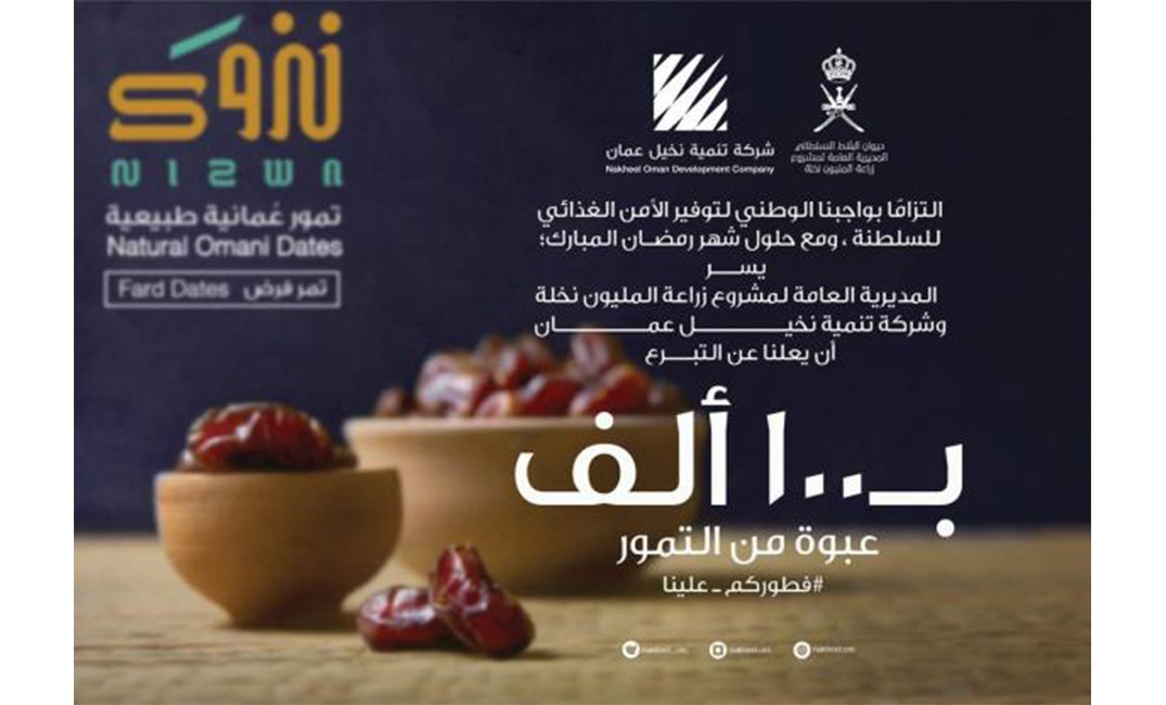 أعلنت المديرية العامة لمشروع زراعة المليون نخلة وشركة تنمية نخيل عمان، عن التبرع بـ100 ألف عبوة من التمور العمانية المنتجة من مزارع المشروع. وقالت المديرية إنه سيتم توزيع هذه التمور على الأسر المعسرة بالتنسيق مع الجمعيات الخيرية في السلطنة، خلال شهر رمضان الفضيل. يأتي هذا التبرع انطلاقاً من الدور المنوط بالمديرية والشركة في المساهمة في […]